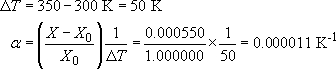 The length of a steel rod is precisely measured to be 1.000000 m at 300 K. When heated to 350 K it is measured again and found to be 1.000550 m. Assuming the change to be linear, calculate the coefficient α.